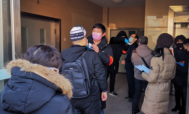 在公司总部四个办公场所入口,各单位领导在现场维持秩序;各支部党员们冲锋在前,测体温、消毒、登记一丝不苟。